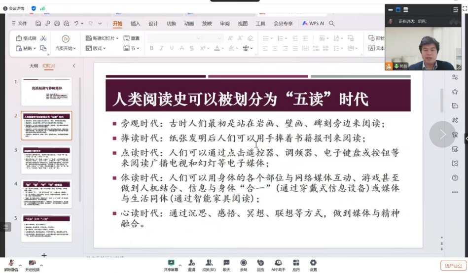 讲座期间,陆地教授凭借其深厚的学术底蕴和丰富的教学经验,为党员和积极分子们带来了一场知识盛宴。他以“五读”时代的推进邀请大家走进人类阅读史,并结合大量生动的案例深入浅出地剖析了“阅”“读”“写”“作”的差异,鼓励大家在求知、逐梦的过程中,要学会用阅读将书读薄、以写作将己变厚,时刻饱有思维的活力。从经典文学作品到现代文化的深究,到阅读和写作意义的详细阐述,都让党员们听得津津有味,收获颇丰。
