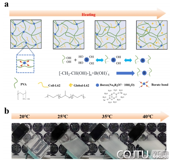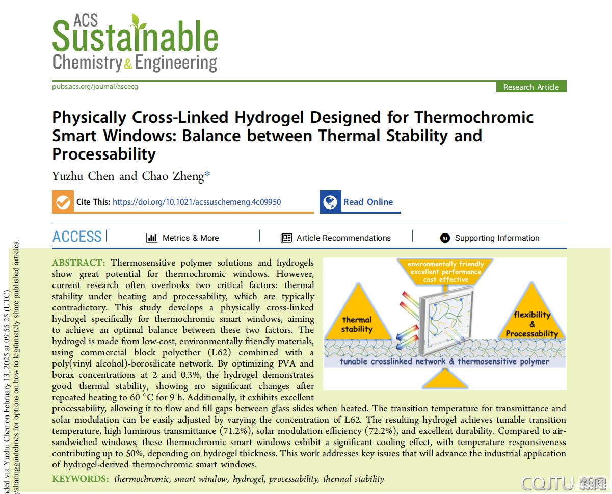 热致变色智能窗的透光率能够随温度发生变化,是一种服务“双碳”战略目标,降低建筑能耗的绿色低碳技术。该论文主要解决了热致变色智能窗用水凝胶热稳定性和加工性之间的矛盾,极大提升了实际应用的技术成熟度。目前热致变色智能窗用温敏水凝胶存在体积收缩、难加工、热稳定性差等问题,其根本原因在于共价化学交联网络在相变时的收缩,以及温敏性溶液相分离引起的沉淀。为此该论文创新性地引入物理交联网络,实现热稳定性与可加工性之间的最佳平衡。该水凝胶由低成本、环保的原料制成,体系随温度升高发生溶胶-凝胶转变以实现在特定温度下的流动加工特性。此外通过优化配方比例得到具有良好热稳定性以及高可见光透过率(71.2%)和太阳光调制效率(72.2%)的热致变色智能窗。