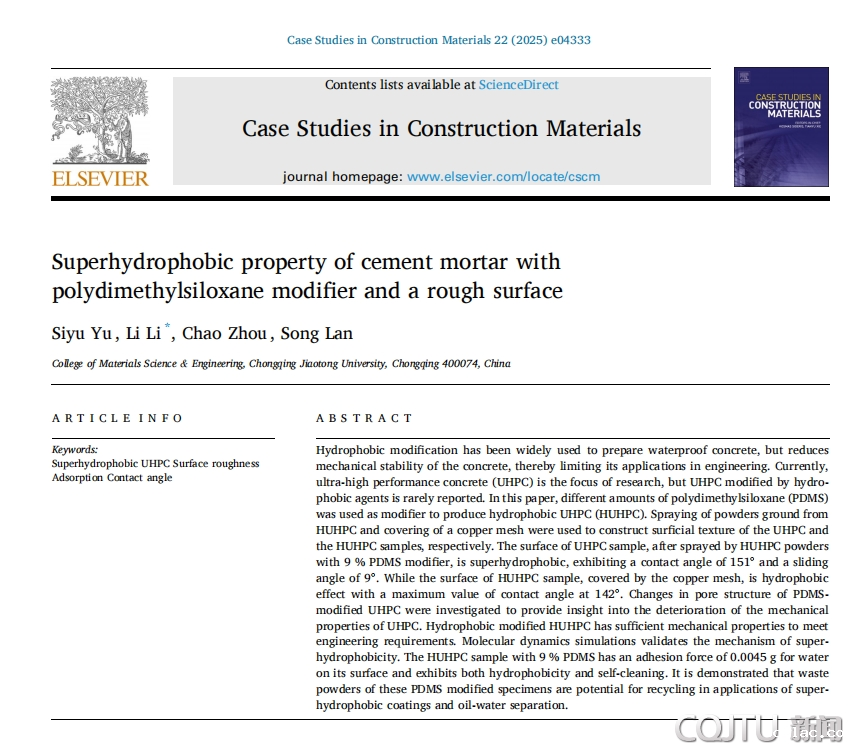 近期,材料科学与工程学院硕士研究生余思宇(指导教师李力副研究员)和陈雨竹(指导教师郑超副教授)分别在国际知名期刊Case Studies in Construction Materials和ACS Sustainable Chemistry & Engineering发表了题为《Superhydrophobic property of cement mortar with polydimethylsiloxane modifier and a rough surface》、《Physically Cross-Linked Hydrogel Designed for Thermochromic Smart Windows: Balance between Thermal Stability and Processability》的学术论文。