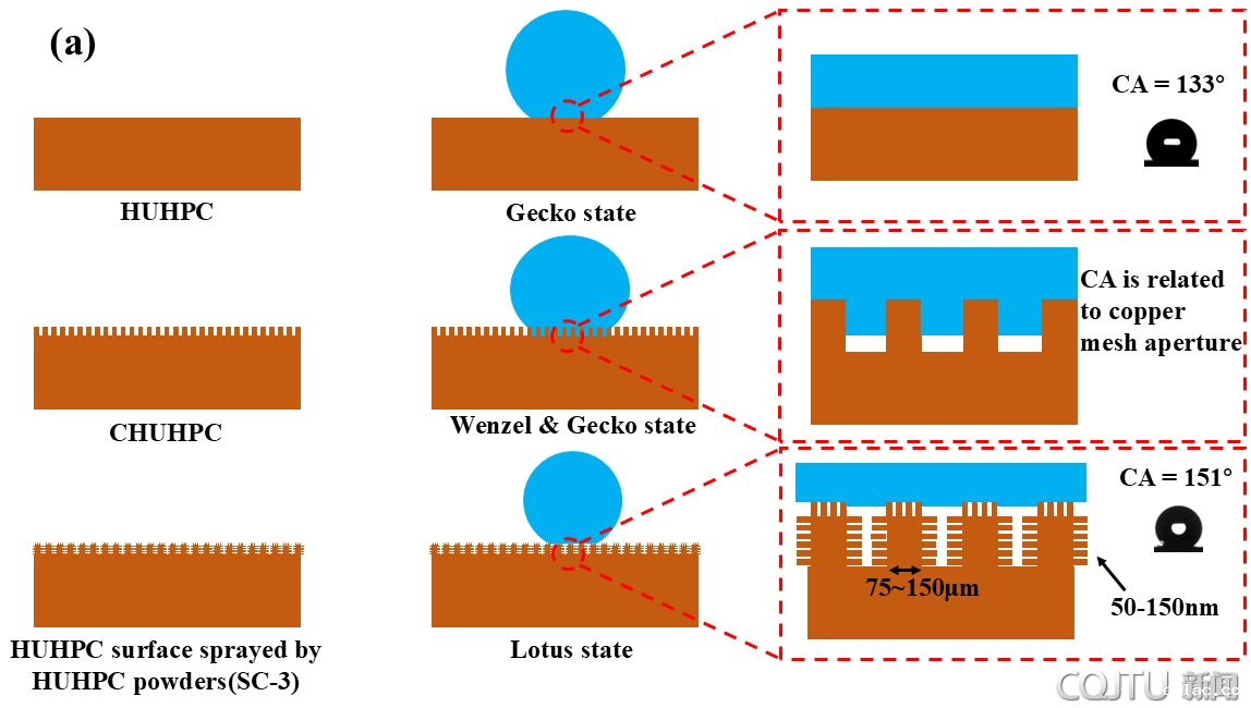 疏水改性已广泛应用于制备防水混凝土,但降低了混凝土的力学稳定性,从而限制了其在工程中的应用。目前,超高性能混凝土(UHPC)是研究的重点,但疏水剂改性UHPC的报道较少。该研究通过改进混凝土配合比与调整表面处理方法,制成了具备优异力学性能与疏水能力的超疏水水泥基材料。首先,制备了不同掺量PDMS(HUHPC)的UHPC砂浆,并采用喷涂高性能混凝土粉末和覆盖铜网两种方法构建表面织构。其次,用含9%PDMS的HUHPC粉末喷涂的UHPC样品具有超疏水性(CA=151°,SA=9°)。分子模拟结果表明,PDMS改变了水与样品表面之间的主导力,由静电力变为范德华力,能够显著降低水与混凝土表面吸附力的大小。通过铜网覆盖或粉末喷涂改变表面粗糙度,有利于表面的静电作用力。最后,将废旧超疏水水泥基材料粉末制成油水分离装置,实现了水与油的成功分离。研究结果表明,高性能混凝土粉体废弃物在超疏水涂料、油水分离等方面具有潜在的回收利用价值,具有一定的回收利用潜力。