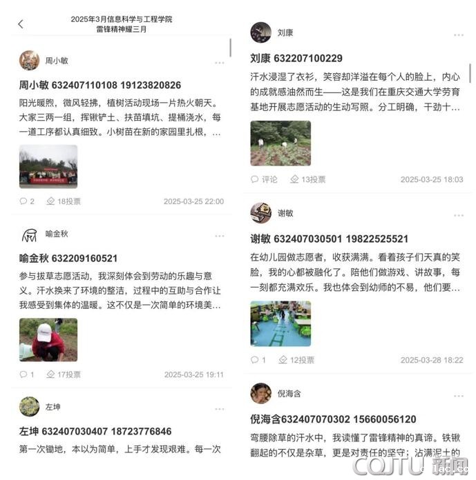 在作品上传至学习通平台后,线上投票环节异常激烈。同学们纷纷为自己喜欢的作品投上宝贵的一票,投票页面热闹非凡。根据活动规则,满10票即视为有效参与本次活动,而众多同学的作品都轻松达到了这一标准,这也从侧面反映出同学们对志愿活动的热情与关注,以及对雷锋精神的认同与传承。投票过程中,同学们不仅为自己班级或社团的成员加油鼓劲,也为其他优秀作品点赞,展现出校园内团结友爱、积极向上的氛围。