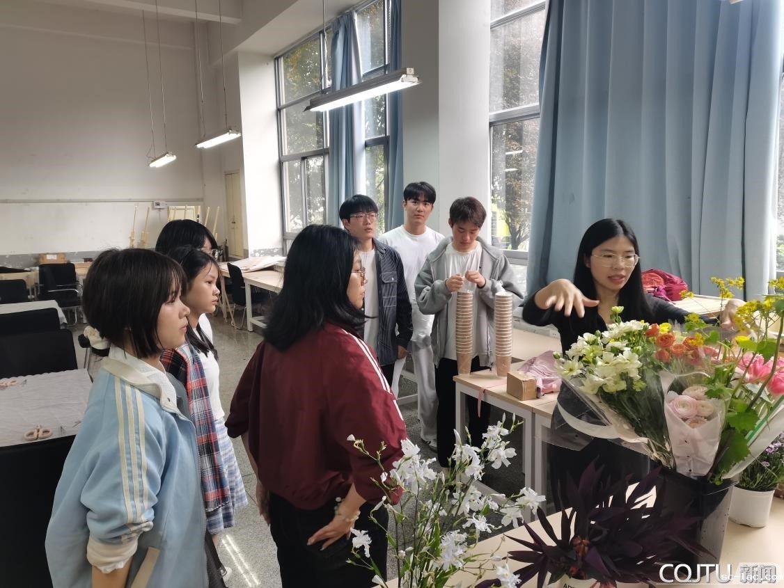 主题插花创作环节时,同学们在导师的指导下自由选取花材,修剪枝叶,组装作品,根据自己的情绪和感受进行创作,并通过分享创作灵感与感受,与其他同学进行交流互动。该情感表达与互动的方式,使参与师生的归属感均得到提升。