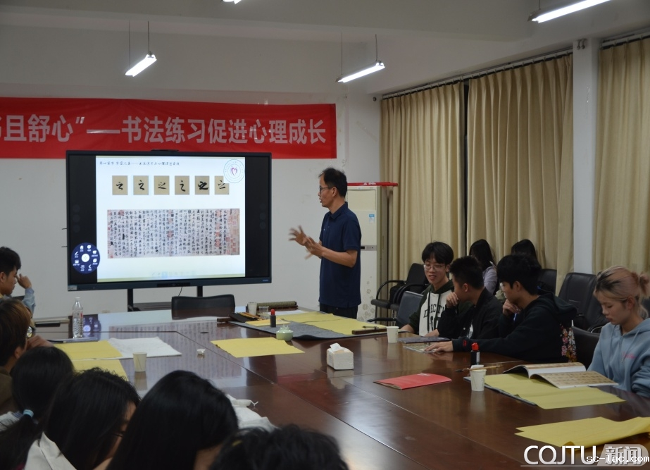 活动以书法常识切入,在一物一品、一点一画中认识书法周边,通过对书法工具认识及鉴别,同学们初步了解了书法练习的准备工作。通过对不同字体不同书法风格的直观心理感受,分享书法与力量、审美、人文素养、人格素质,尤其是书法与心理成长的深层联结。“笔迹即心迹”,颜真卿《祭侄文稿》中的悲怆情感,生动阐释“书法是中国人精神力量的具象化表达”。在互动环节,韩老师现场演示点画书写,引导同学们通过提、按、顿、挫感受笔尖的力量收放,细听笔触与纸张接触的声音,感受行笔过程中的专注的心理状态。