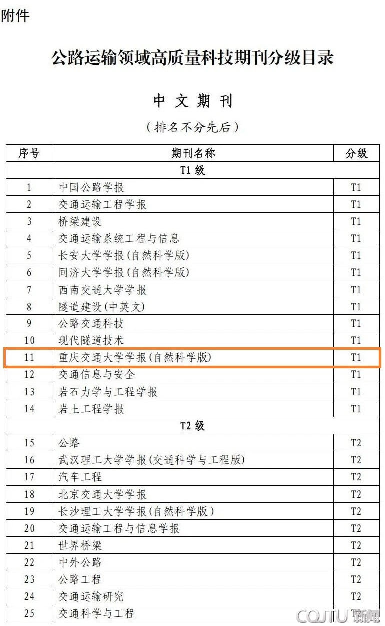 为深入落实《关于深化改革培育世界一流科技期刊的意见》,推动建设与世界科技强国相适应的科技期刊体系,助力我国科技期刊高质量发展,在中国科协的统一部署下,中国公路学会组织中国工程院院士、中国公路学会副理事长、评审委员会组长张喜刚,中国工程院院士、中国公路学会副理事长郑健龙,中国工程院院士王复明,中国工程院院士杜修力,中国工程院院士何川等行业著名专家进行评审,发布了2024年度《公路运输领域高质量科技期刊分级目录》。我校主办的《老伟德网上娱乐学报(自然科学版)》与《同济大学学报(自然科学版)》、《长安大学学报(自然科学版)》、《西南交通大学学报》等4家高校期刊一起被认定为T1级。