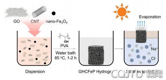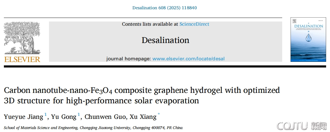 近日,我校材料科学与工程学院研究生蒋月月和本科生龚于以第一作者署名在Desalination(期刊影响因子为8.3)发表了题为“Carbon nanotube-nano-Fe3O4composite graphene hydrogel with optimized 3D structure for high-erformance solar evaporation”的论文。在本学院老师向旭副教授的指导下,该论文系统介绍了一种由nano-Fe3O4和CNTs协同增强的rGO复合水凝胶,用于太阳能蒸发器。通过加入PVA 增强其亲水性,确保了水分子的高效传输。此外,蜂窝状的三维结构有助于减少蒸发器表面的蒸发死区,提高蒸发器的蒸发效率。这些策略可能为相关的研究工作提供了有价值的参考。