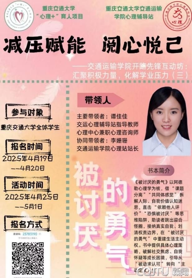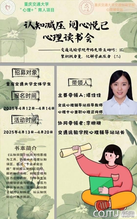 4月13日至5月1日,在第20个世界读书日期间,交通运输学院心理辅导站面向全校学生开放,开展“认知减压 阅心悦己”暨“汇聚积极力量 化解学业压力”系列心理读书会,引导学生从阅读中汲取心理能量、优化自我认知、化解学业压力,让书香成为成长的阶梯。活动分两期进行,由谭佳佳和李姗珊领学。