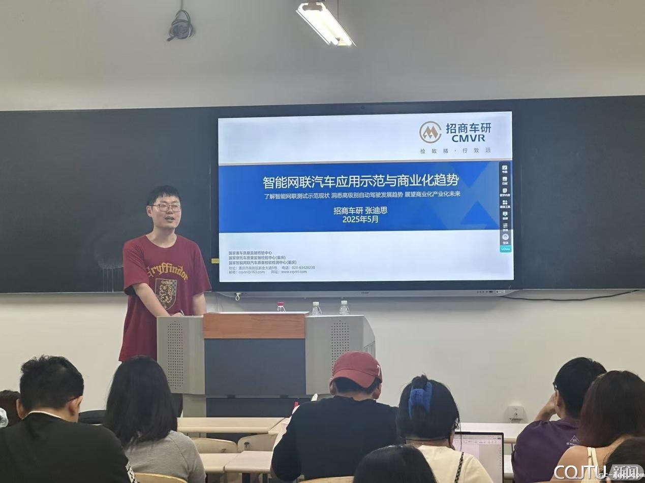 为深化交通运输学院本科生对智能网联汽车应用示范与商业化趋势的认知,依托交通运输专业前沿微课《智慧出行》,2025年5月23日晚,交通运输学院邀请了招商车研国家智能网联汽车检验检测中心副总工、电子通信测试研究室主任张迪思工程师在南岸校区第二教学楼213教室举办“智能网联汽车应用示范与商业化趋势”主题讲座,交通运输(卓越班)的同学踊跃参与。