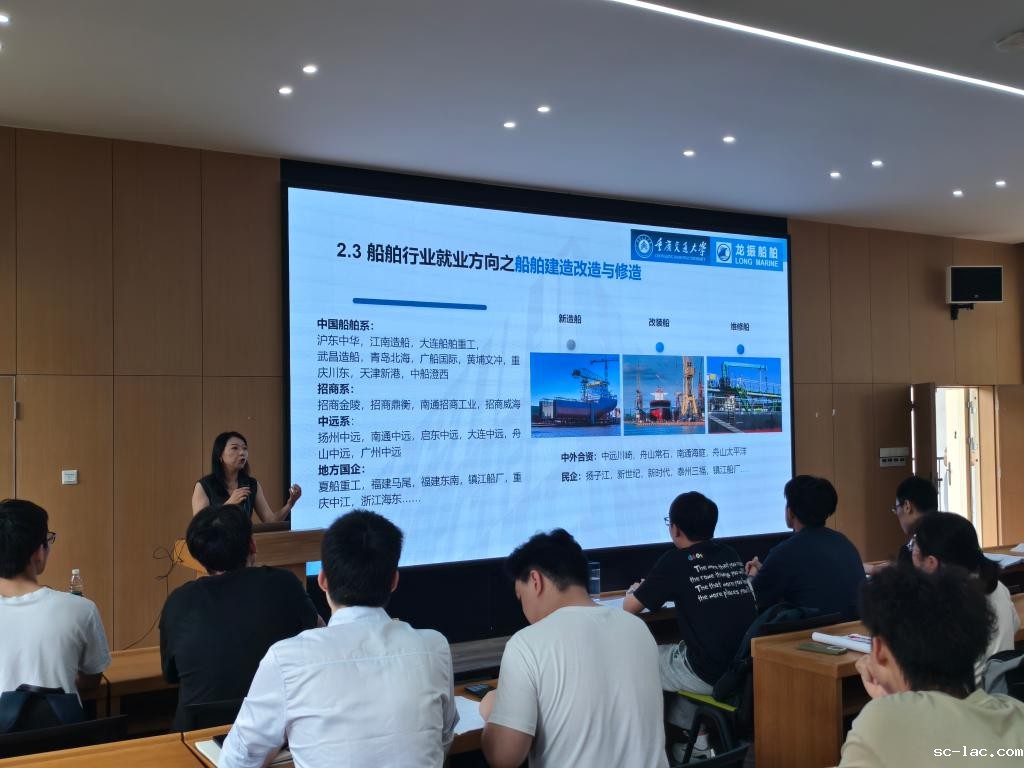 6月4日中午,首场讲座在南岸校区第一教学楼301报告厅举行,主题为“船舶行业发展及就业方向”。龙振船舶技术有限公司总经理谭廷燕受邀担任主讲嘉宾,以深厚的专业素养与丰富的实践经验,系统梳理了全球及中国船舶工业的发展现状与未来走向。