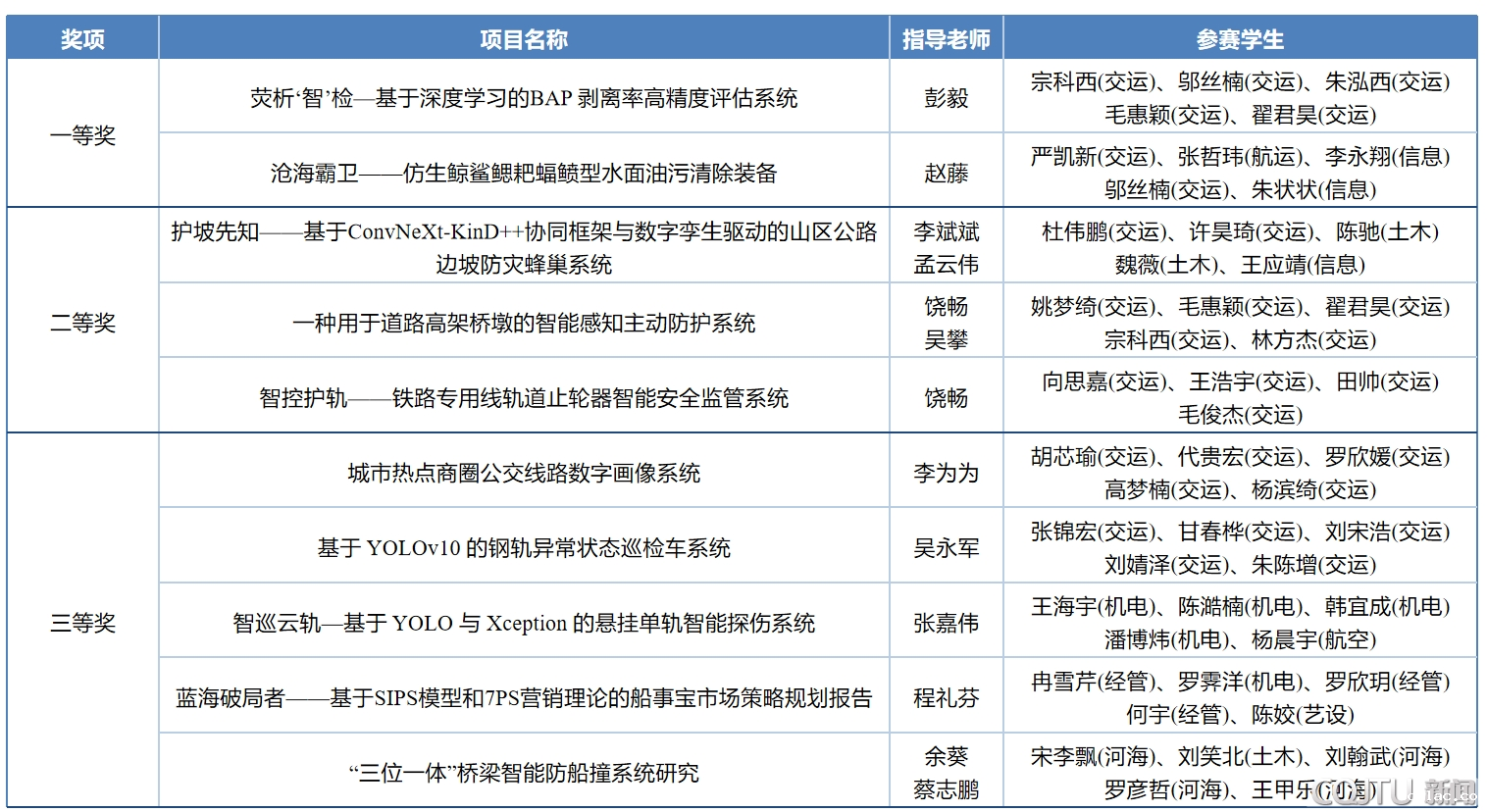2025年5月23日至25日,由中国交通教育研究会、中国交通运输协会、教育部高等学校交通运输类专业教学指导委员会主办的“船视宝”杯第二十届全国大学生交通运输科技大赛在厦门集美大学举行。全国144所高校提交了1232件作品参与角逐,经专家组评审,87所高校266个项目进入决赛并到现场答辩。最终,我校共10件作品获奖,其中全国一等奖2项、二等奖3项、三等奖5项,同时博士生赛道取得突破,获奖数量再创佳绩。