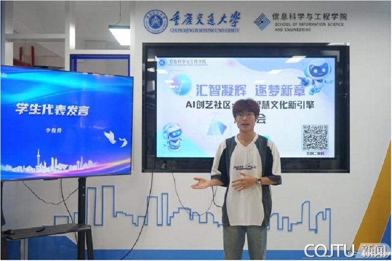 接下来,获奖学生代表李俊烨同学登台,仔细讲述AI创作背后的思考与突破,结合亲身经历,分享如何平衡技术逻辑与创意表达、如何在调试中迭代灵感。毫无保留的“技术干货”与真诚感悟,让同学们获益良多。