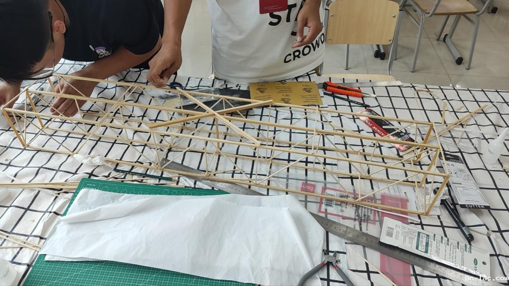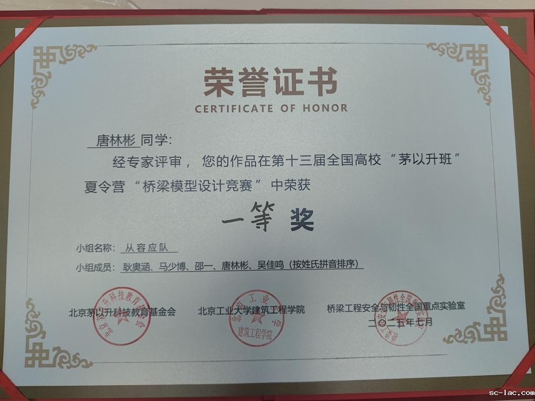 桥梁模型设计竞赛环节,营员们分组协作,完成从方案论证、结构设计、模型制作、加载测试的全流程实践。竞赛中,学院“茅以升班”的唐林彬、吴佳鸣与其他高校营员联合组队,结合张弦桥与桁架桥特点,采用竹-纸组合梁截面,利用软件模拟受力分析,最终在三级加载测试中表现出色。评审环节中,该组以优异成绩斩获一等奖,其创新设计与严谨计算能力获得专家高度评价。
