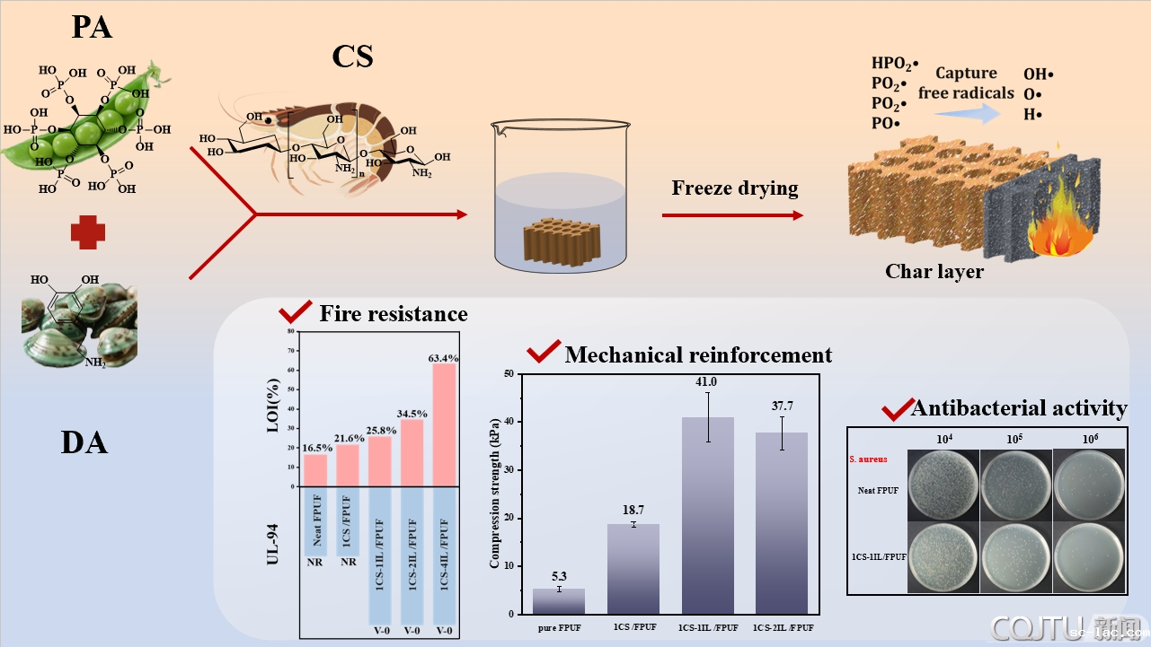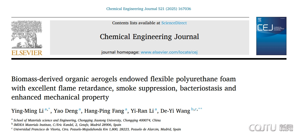 材料科学与工程学院李映明副教授课题组在高性能阻燃高分子材料领域取得重要研究进展,相关成果以“Biomass-derived organic aerogels endowed flexible polyurethane foam with excellent flame retardance, smoke suppression, bacteriostasis and enhanced mechanical property”为题发表在Chemical Engineering Journal(期刊影响因子为13.3),该研究获得国家自然科学基金委联合基金重点项目的资助。