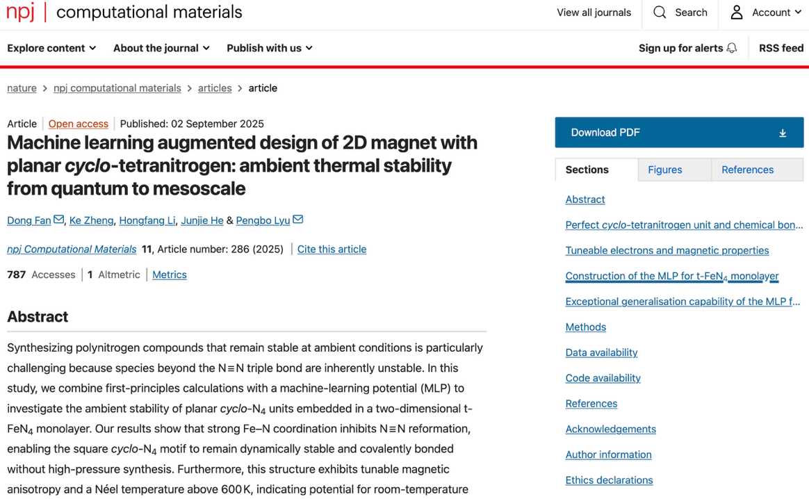材料学院青年教师樊冬在国际顶级期刊Nature子刊npj Computational Materials上发表了题为“Machine learning augmented design of 2D magnet with planar cyclo-tetranitrogen: ambient thermal stability from quantum to mesoscale”的学术论文。老伟德网上娱乐为论文第一通讯单位,学院2024级硕士研究生郑柯为第二作者,学院樊冬博士和湘潭大学吕蓬勃博士为论文共同通讯作者。