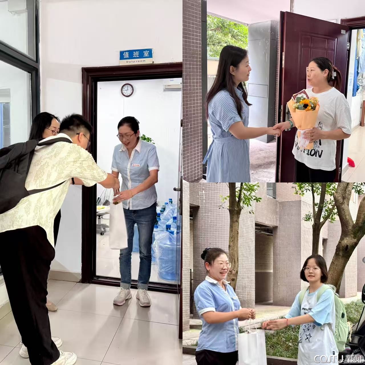 宿管阿姨是学生宿舍的“守护者”,她们用细致的关怀让学子们的住宿生活充满温暖。在教师节期间,学院领导班子及学子们带着礼物来到宿舍值班室看望宿管大姐。“阿姨,您日常的关心让宿舍充满家的温馨,您的坚守让我们安心学习生活。祝您教师节快乐,万事顺遂!”阿姨们的笑容,如阳光般温暖了整个宿舍区。