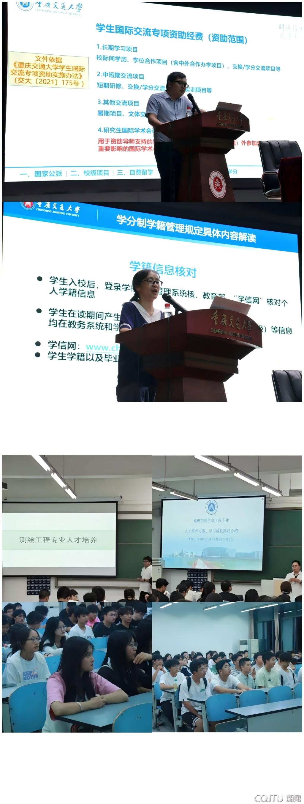 院长助理、学科办主任朱康文老师向全体新生介绍了学校的学生国际交流项目,教学办副主任张建梅老师向全体本科生解读了学籍管理规定。学科办、学工办、各系部负责人及新生辅导员面向相关学生群体分别就研究生培养与学籍管理、校规校纪、安全事项、第二课堂活动、人才培养方案、学习成长路径等内容进行交流介绍。