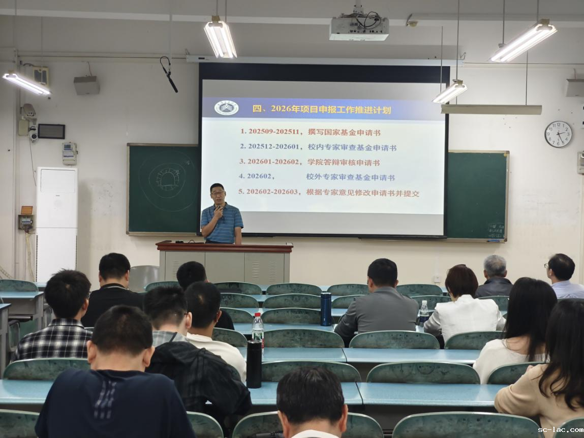 会议伊始,王其林院长以翔实数据开篇,全面汇报 2025 年度基金申报工作。据统计,学院2025年国家自然科学基金、重庆自然科学基金、重庆自然科学基金3个类别基金项目有11 项获立项资助,他从申报项目类别、整体推进过程、最终立项情况等方面,全面梳理学院过去一年在基金申报领域的工作成果,客观分析申报过程中呈现的优势与不足,尤其针对选题创新性、团队协作效率、材料撰写细节等关键环节的待改进之处进行重点说明,为后续工作优化提供清晰指引。