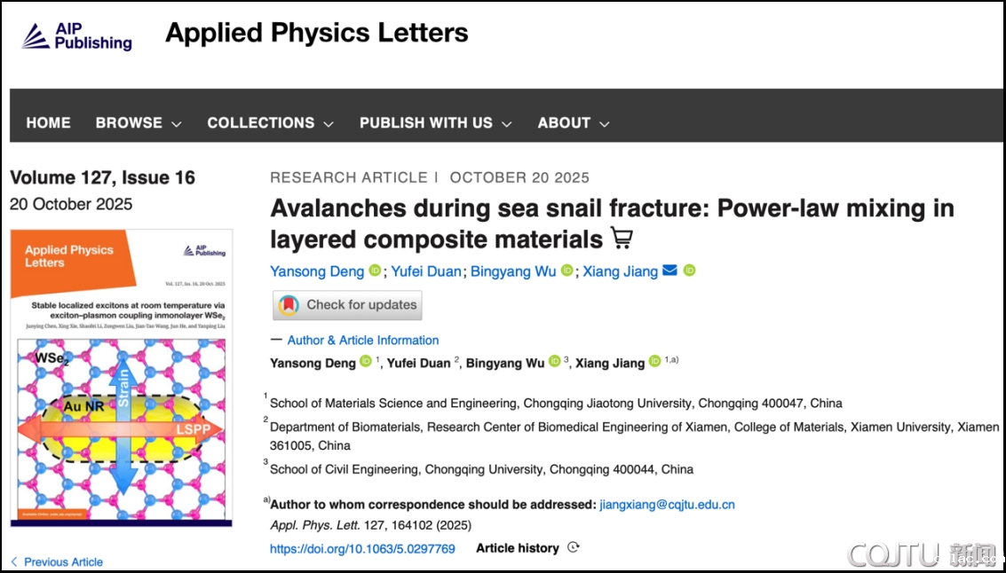 近日,我校材料科学与工程学院蒋翔教授课题组在自然指数期刊、国际著名物理学期刊Applied Physics Letters上发表了题为“Avalanches during sea snail fracture: Power-law mixing in layered composite material”的层状复合材料破坏雪崩动力学研究成果。论文第一作者为材料科学与工程学院2023级硕士研究生邓岩松,通讯作者为蒋翔教授。