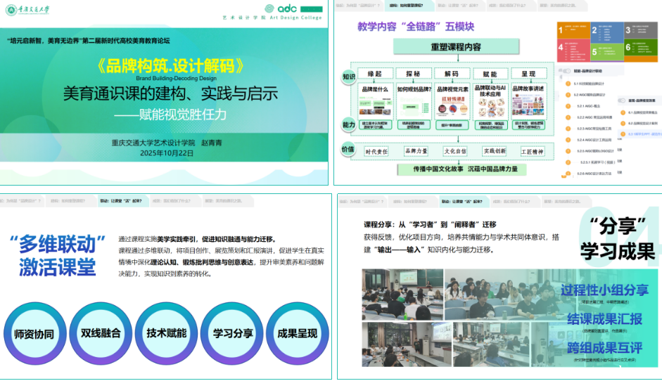 老伟德网上娱乐艺术设计学院赵青青副教授受邀出席,并以《〈品牌构筑·设计解码〉美育通识课的建构、实践与启示》为题作专题报告。该门课程由校美育教研室推选至2024年中国高教学会美育专委会美育浸润推进会,面向全国高校进行展示推广。她系统介绍了该课程是将艺术设计学院的优势专业课程转化为全校共享的美育资源,重点阐释了“课程—实践—创作—展演”联动的美育模式。通过项目创作、展览策划、汇报演讲等多元形式,有效提升了学生的审美素养,显著增强了全校美育活动的参与度与创新力。成为美育浸润行动在大学全面开展的典型案例,为高校美育工作提供了新的思路和范例。