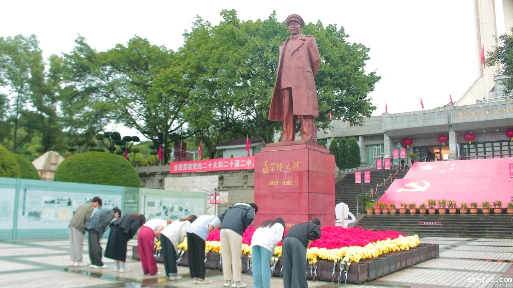 陈列馆广场中央,聂荣臻元帅铜像巍然矗立。全体师生整齐列队,开展了一场别开生面的场景互动。辅导员王老师首先引导大家观察铜像的细节,从元帅坚毅的神情到挺拔的姿态,让大家直观感受元帅的伟大风范。随后,师生们怀着无比崇敬的心情,向元帅铜像鞠躬献花。在这个过程中,辅导员老师适时提问:“大家想想,聂帅一生为了国家和人民,付出了无数心血,我们今天献上的鲜花,代表着什么?”同学们纷纷思考并回答,有的说代表敬意,有的说代表传承。