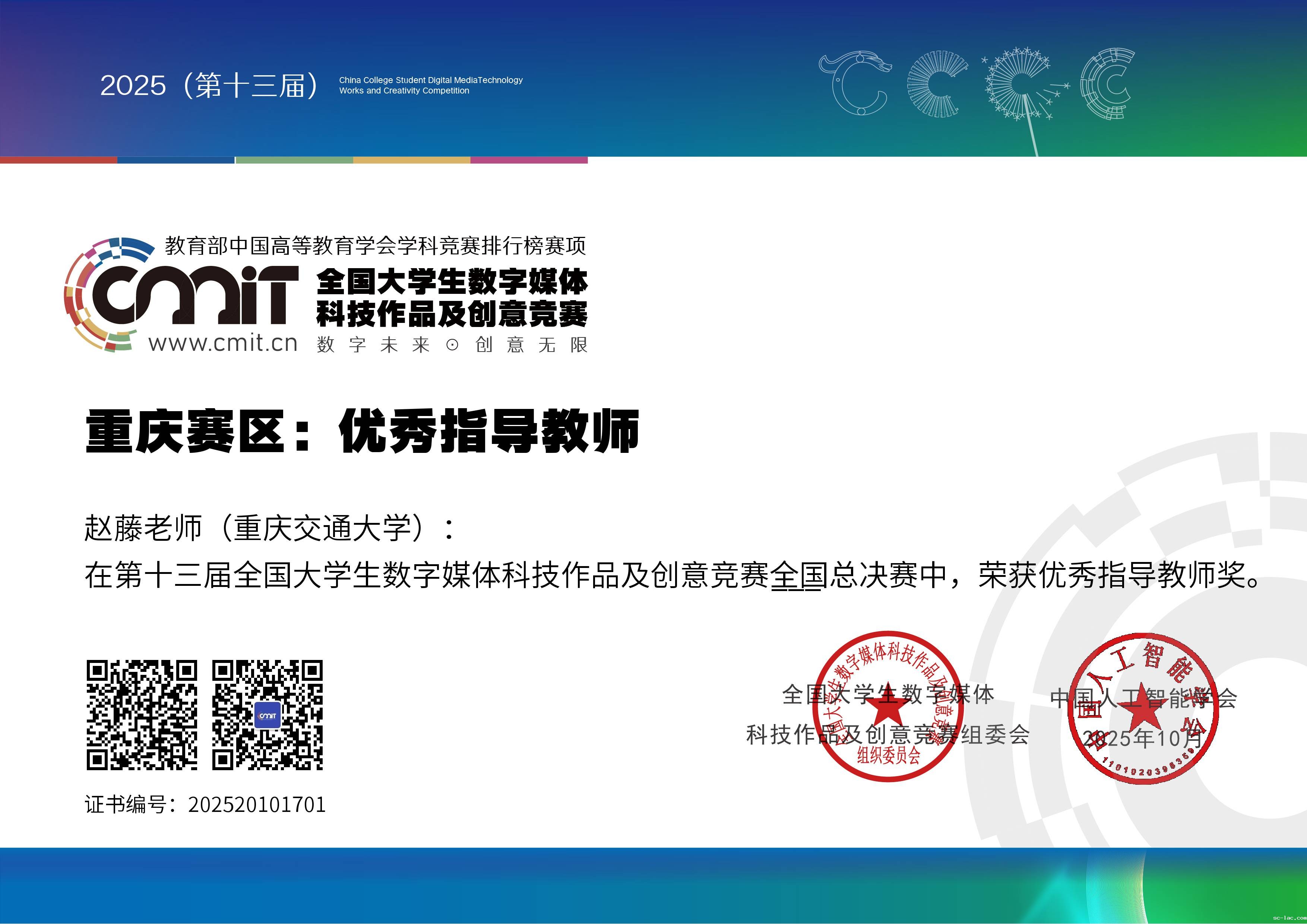 在此次大赛中,我校学生热情投入,展现了团结协作、勇于创新的精神。航运与船舶工程学院赵藤老师指导的《沧澜卫士——全域水上救援机器人》,经严格评审,以重庆赛区一等奖晋级全国总决赛。在全国总决赛中,该作品凭借前瞻性创意、可靠技术及团队现场答辩的出色表现脱颖而出,获全国二等奖。这一成绩肯定了团队努力与才华,彰显了学院在数字媒体科技领域的育人底蕴和对学生创新实践能力的培养成效。同时,凭借多年来在指导学生竞赛方面所积累的丰富经验和取得的突出成果,赵藤老师被授予重庆赛区优秀指导老师的荣誉称号,这既是对其个人专业指导和辛勤付出的高度认可,也是对我校教师队伍教学与指导能力的又一次有力证明。