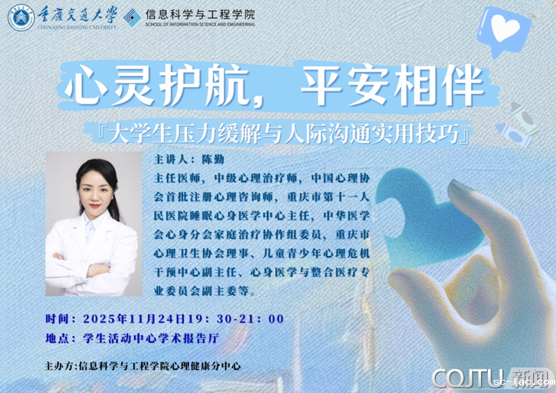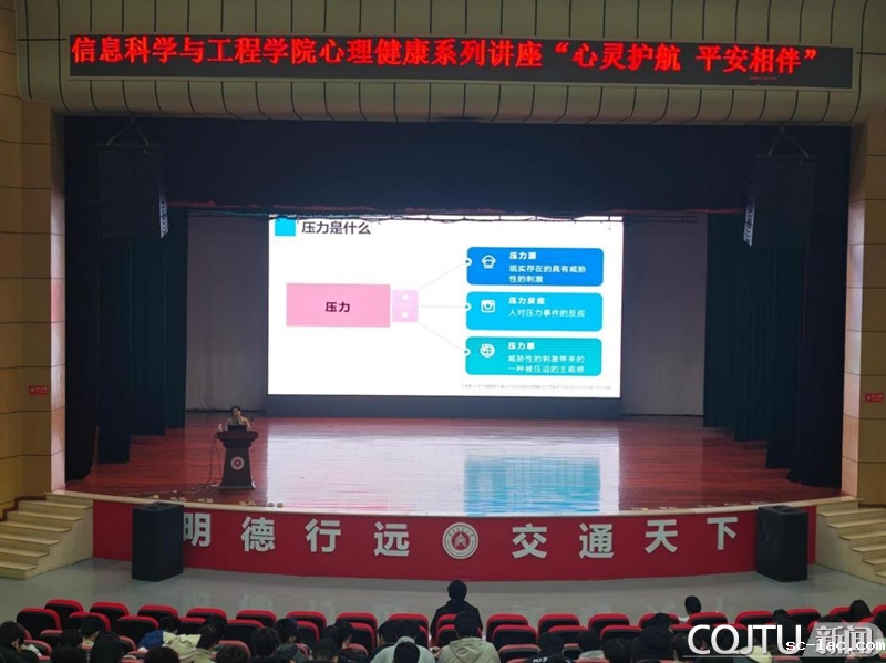 信息科学与工程学院高度重视关心同学们身心健康和学业情况,为扎实推进学生心理健康教育工作,筑牢低年级学生心理健康防线,帮助学生更好应对学习压力、提升人际沟通能力,11月24日19:30,心理健康分中心在科学城校区学生活动中心学术报告厅举办“大学生压力缓解与人际沟通实用技巧”专场心理健康讲座。