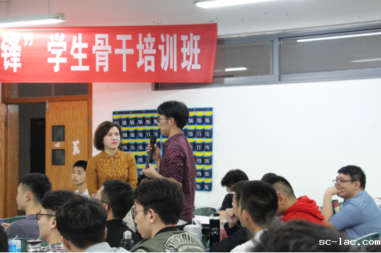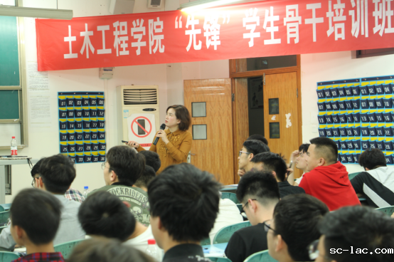 2019年4月16日晚18:30,土木工程学院“先锋”学生骨干培训班在南岸校区第二教学楼205室开班授课,此次培训由土木工程学院党委副书记舒琳老师带来第一讲,其目的是提高高校学生干部领导力。参加本次培训的有办公室副主任王辉老师,辅导员张小琴老师,全体学生会及研会干部和本科各班班长与团支书。本次培训会由研究生辅导员全纪宇老师主持。