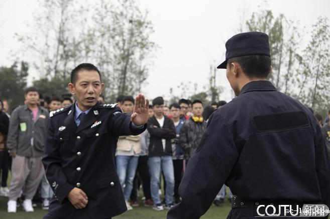 交流中,为了让大家知道遇到砍刀袭击时不应只顾逃跑,郑勇警官与搭档杨昭中队长为同学们做出了一场精彩的演示。郑勇警官多次强调道:“遇到危险时最好是采取正面迎击的方法,与同伴要有团队意识,包围暴徒,分散其注意力,并善于利用周边物体作为武器,维护自己的生命安全。”