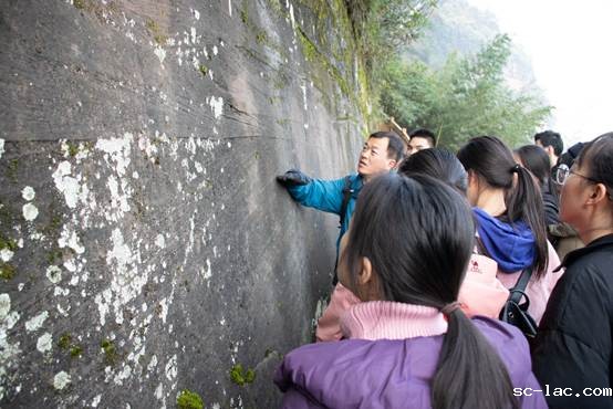 进入地质公园,沿着手爬岩路线前进。李东老师在莲花湖水库下为同学们讲解该区的地质构造背景,在朝音洞前通过其表现出来的重力地貌和河流地貌,口头复现了该区河流阶段的演化过程。结合地质公园的丹霞地貌样态,李东老师将课本中的地貌演化机制讲解得清晰透彻,同学们也学得清楚记得准确。他还要求同学们要培养将知识与看得见的地质现象模型化,学会讲述一座山、一条河的“故事”。