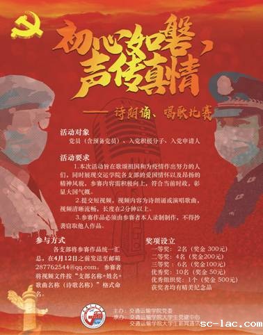 2020年,因新冠肺炎影响,不仅中国乃至全世界都正在为这场无声战斗而拼搏。在这个举国奋战的时刻,交通运输学院党委举办线上的诗歌朗诵、歌唱比赛,以此来号召全院师生谨守初心,砥砺前行,向那些一直在我们背后默默奉献,无私付出的人们致敬。学院入党积极分子、预备党员以及党员踊跃参加。