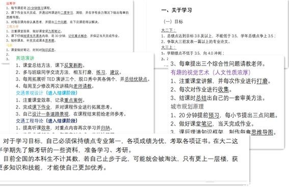 岁月不居,时节如流。时光弹指间消逝,同学们在学习计划中做到了把握当下,善抓眼前,要年轻,要努力。努力不是嘴上飘,交运学子给自己定下学期目标并制定学习计划,严格按其执行。有同学要求自己学期绩点不低于3.5,并在一学年内发表至少一篇专业论文;有同学要求自己保持专业第一,各项成绩为优,考取各项证书等等。他们对每门课程的学习均作出了详细安排,确保各项科目兼顾,对落后科目进行针对性的练习提高,有效促进自身学业进步。趁着激情与热爱正浓时,及时当勉励,抓住学习的手,在春秋的喧嚣,冬夏的温差都变的如画伴随一些日落色的牵挂中不留遗憾。