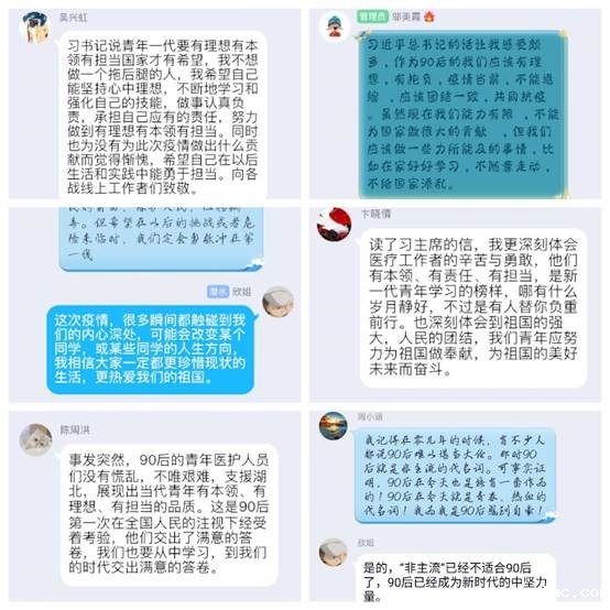 线上讨论紧紧围绕习近平总书记在回信中传达的精神内涵,“90后”“新青年”“责任与担当”都是师生们常常谈到的关键词。张东鹏说:“从总书记的回信中,可以看出总书记给予北大援鄂‘90后’党员的肯定,也看出了总书记对当代大学生的期望,我们要提高自己的水平,做到能够担当,敢于担当。让自己的青春变得更加绚烂多彩,在人民最需要的地方绽放绚丽之花!”