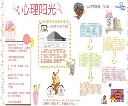 同学们为此专门开展了手绘、Word制作小报等形式,表达出自己对情绪、压力、人际、爱情、心理异常等方面的关注,对大学生中存在的一些心理现象、心理问题进行了反思,以及对如何减压、释放负面情绪提出了自己的解决办法。