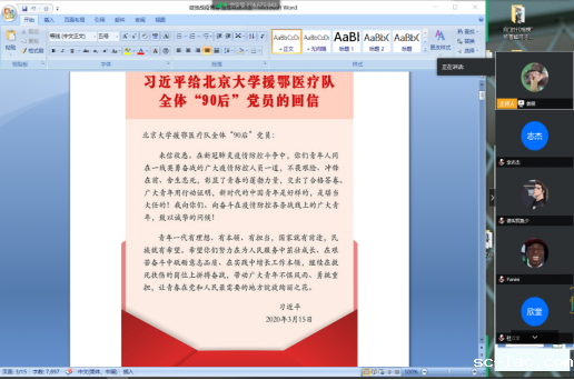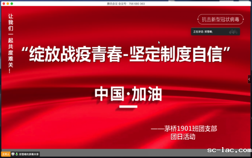 各级团支部采用线上模式开展以“绽放战疫青春·坚定制度自信”主题的网络会议。会上,团支书组织同学们一道学习习近平新时代中国特色社会主义思想,阅读《习总书记给北京大学援鄂医疗队全体“90后”党员的回信》,观看疫情期间广大优秀青年投身疫情战役的宣传短片,牢牢抓住理论学习,持续掀起“青年大学习”的热潮。