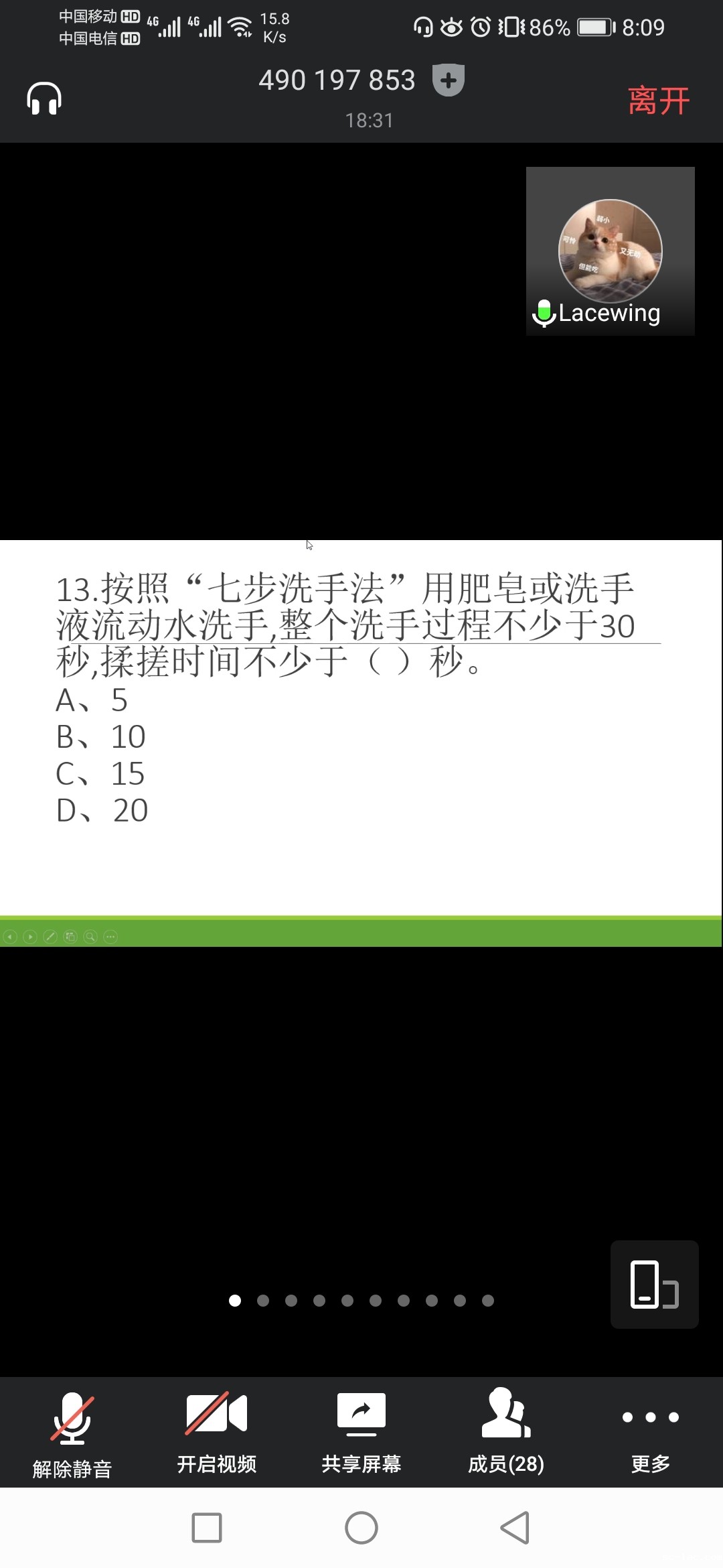 受疫情影响,此次活动采用腾讯会议线上答题的形式开展。知识竞赛题型包括单项选择题、判断题、多项选择题,内容涵盖了大学生心理健康常识及新冠疫情的相关知识,参赛选手通过抢答的方式进行。经过众多选手1个小时的精彩角逐,外国语学院心理辅导中心的工作人员统计出本次活动的前三优胜者。15号选手抢答次数最多,正确率最高,最终取得本次竞赛第一名。