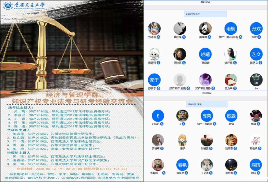 近日,经管学院知识产权专业广大师生,利用疫情时期特殊毕业季课余时间,线上进行了一场别开生面的师生交流会。活动以“法考研考”为主题,邀请该专业2019届、2020届13位法律职业资格考试和研究生考试成功上岸的同学,分享自己复习备考的心得体会和经验教训。活动得到知识产权教研室全体教师积极响应,吸引了该专业三个年级近160名师生参与,活动由2017级学业导师黄英老师主持。