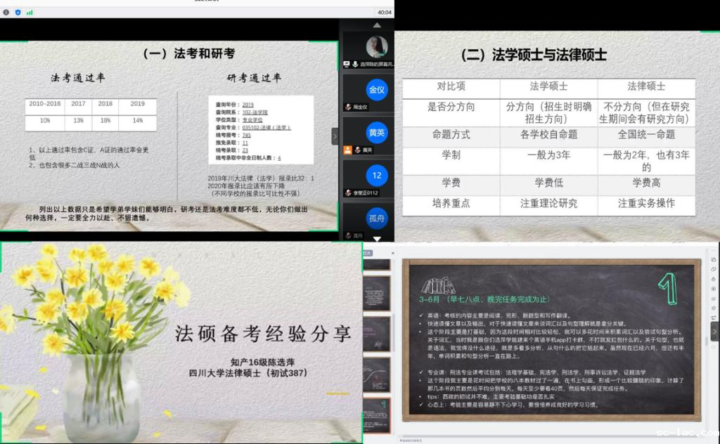 交流会足足持续了三个小时,分享给同学们的都是100%干货,并主动留下联系方式以便学弟学妹们进一步地沟通交流。一位分享的同学说:“很开心能把自己觉得最重要、最有特色也最有价值的内容进行分享,满足学弟学妹的需要。”参与的同学在聊天室积极与学长学姐们互动,表示收获满满,进一步增强了研考、法考的信心。