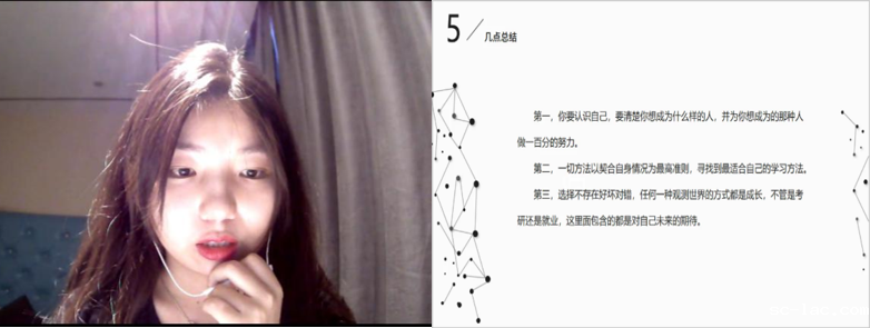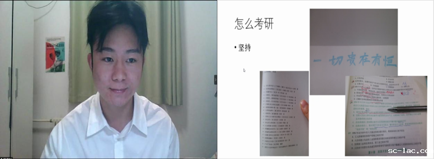 以复试成绩第一,综合成绩第二考入江苏大学的朱丹妮围绕考研中的院校和专业选择、公共课的备考经验、时间安排、情绪调节几个方面作了针对性地分享。她直言,在备考过程中会出现情绪崩溃、想要放弃的时刻,此时我们不要否定自己,而要直面自己内心,在想到成功后可以进入更高学府这一成就时,就可以继续坚持下去。“如你所愿,成功上岸”,朱丹妮给准备考研的学弟学妹送上了祝福。