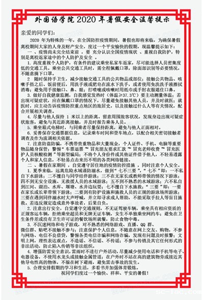 为科学、有效应对疫情,强化防控,确保学生的生命安全和身体健康,2020年7月8日,外国语学院面对全体学生开展了暑期安全教育。
