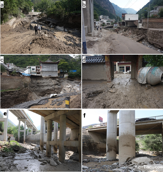 a泥石流导致公路被冲断;b泥石流导致桥面垮塌;c泥石流导致公路、房屋垮塌引起轿车冲入水中;d泥石流溢出河床冲入居民房屋;e泥石流危害沟口公路 、河道;f泥石流冲击沟口桥墩