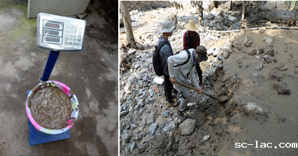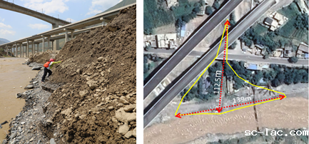 水峪沟沟口泥石流堆积物大部分带入白龙江,并被水冲走。泥石流爆发时冲出沟口的物质淤塞白龙江,使得上游水位壅高约4.5米。8月8号现场实测堆积扇的尺寸如下:堆积扇前缘宽度约139m(沿白龙江流向方向),扇顶至扇缘(白龙江冲刷后的)距离约112.5m,堆积扇的坡度为4度,堆积扇厚度约3-3.5m,扇缘端出露堆积物厚度0-3.5米(图7-图8)。在距沟口约30米处进行了现场泥石流容重测试(图9)。