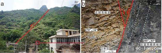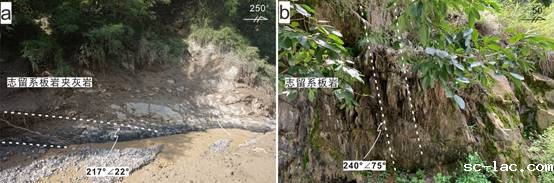 a水峪沟流域下游地层岩性及产状(33.648953N,104.553550E);b水域沟中上游地层岩性及产状(33.660893N,104.590436E)