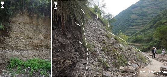 a早期河床两岸的粗粒堆积物;b河床两次早期堆积物的发生的二次滑坡