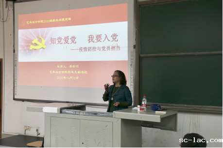 为启迪新生对党的认识,加强学生党员队伍建设,促进学院学生党建工作,2020年10月22日下午16:00,艺术设计学院于双福校区A01237教室组织开展了2020级新生入党启蒙教育。本次新生启蒙党课特邀学院党总支副书记、党校副校长李世佼担任主讲,学生党支部书记兼2017级辅导员刘书超、副书记兼2019/2020级学生辅导员胡金波等出席本次活动,2020级全体新生参加。活动由学生党支部书记刘书超同志主持。