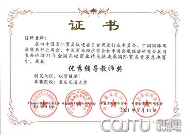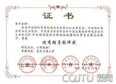 5月6-10日,在宁波国际会展中心举办的2021年全国商业精英挑战赛国贸实践赛全国总决赛中,我校获最佳院校组织奖,经济与管理学院教师宋平和陈科分别获优秀辅导教师奖,“ENEN可视门铃”队(队长余欢,成员舒添欣、杨欣源、夏一涵、兰彦如、段陆菲)和“古法造纸”队(队长符虹厦,成员凯瑟琳·张、宋子怡、党倩、刘佳豪、张卓阳、罗小凤、夏程意)均获一等奖,“素邦洗衣巾”队(队长邱浩文,成员王婉怡、粟滔、易子杰、左祎璠、黄晓骏、董盛豪)获二等奖。