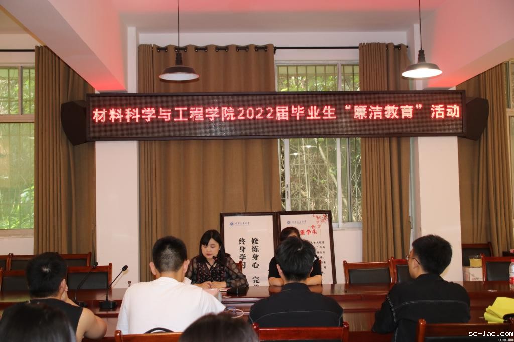 昔来兮,桃李累累;今往兮,杨柳依依。六月毕业之际,为加强毕业生廉洁教育,让青春焕发绚丽光彩,让廉洁成为青春庄严底色,6月15日下午,材料科学与工程学院在南岸校区学院会议室开展2022届毕业生“廉洁教育”活动。活动由学工办主任胡纯主持,院党委副书记黄丽君、学院毕业生参会。