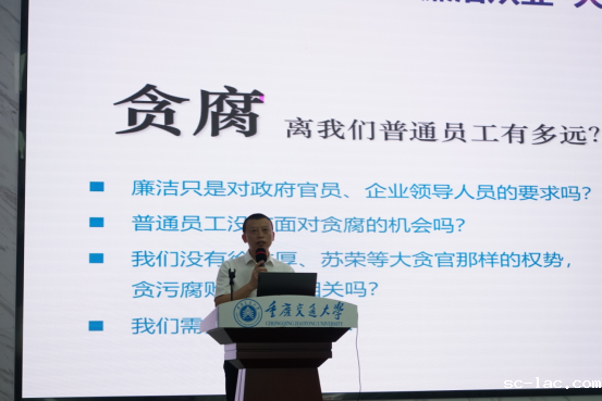 郑廷友从“廉洁从业,人人有责”“廉洁从业,理智选择”“廉洁从业,从我做起”三个方面对大家开展报告讲座,以通讯行业某公司腐败情况为案例,剖析了案件发生的六个特点,强调廉洁从业是企业的要求、法律的要求,也是个人实现自我的要求。通过深入讲述《刑法》等相关法律法规对谋取不正当利益、非法收受他人财物等行为的处罚措施,分析贪腐经济帐、事业帐、家庭帐、精神帐、健康帐等六笔帐,警示同学们腐败所造成的沉重代价是每个人难以承受的,并郑重告诫大家要在思想上强化党的意识、群众意识、责任意识、自律意识;在道德修养上做到慎初、慎独、慎友、慎言、慎好;在实际行动上把好家庭廉政关,守好家庭廉洁“港湾”;把好重点岗位关,树立廉洁新形象;把好廉政监督关,构筑监督防线。