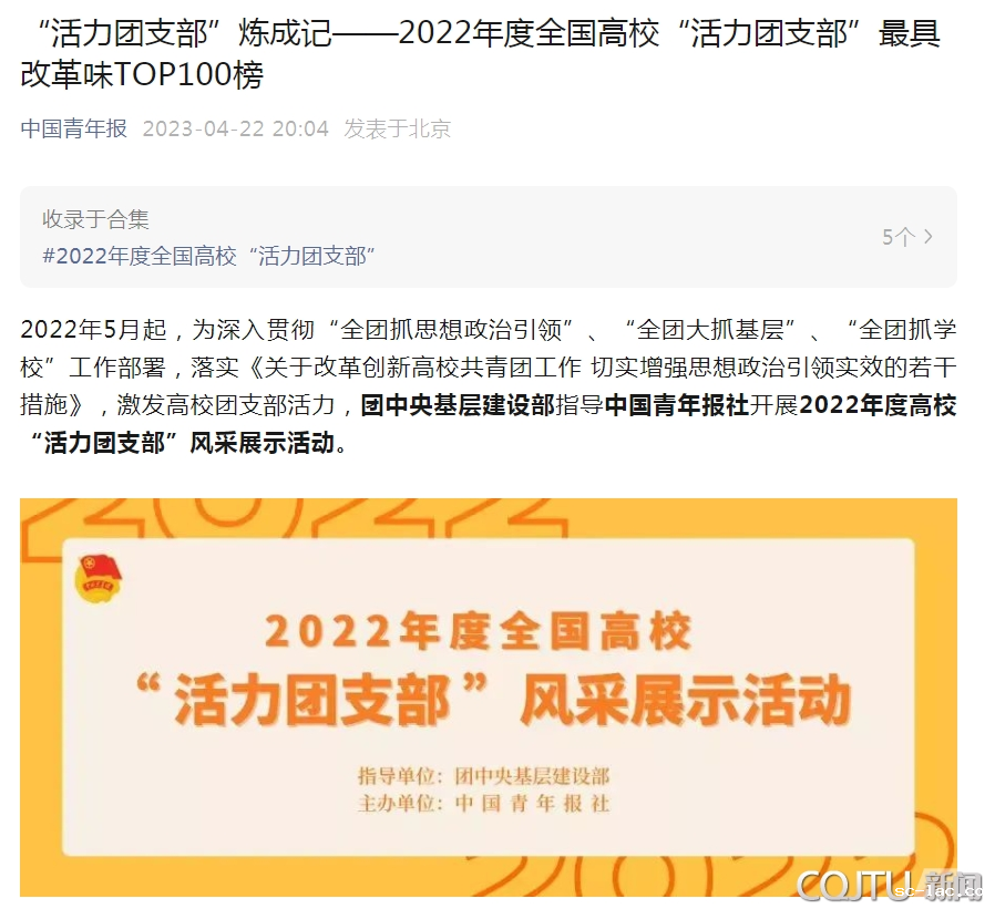 2022年5月起,团中央基层建设部指导中国青年报社开展2022年度高校“活力团支部”风采展示活动。经过校内选树、校级展示、重庆市级展示、全国展示等环节,河海学院2020级地质工程2班团支部(以下简称地质2002班团支部)一路突围,2023年4月22日,成功进入“2022年度全国高校‘活力团支部’最具改革味TOP100榜”,是我校唯一入选的团支部。