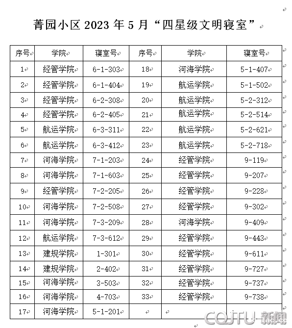 在5月的四星级文明寝室评选中,经宿管部和学生自律委员会推荐,学工部(处)集中审核、公示,学生菁园小区共获评四星级文明寝室33间。