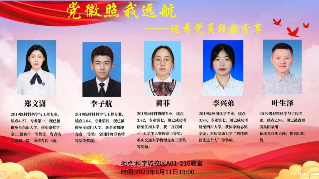为深入推进主题教育走深走实,践行三全育人,2023年6月11日,材料科学与工程党支部在A01 216举办“党徽照我远航,优秀党员经验分享”宣讲活动。此次活动邀请郑文潇、李子航、黄菲、李兴弟、叶生泽五位优秀党员同志分享他们的经验和故事,发挥优秀党员的模范作用,以帮助学院各年级学生明确目标、掌握学习技巧,高效地获取考研、保研及就业信息。