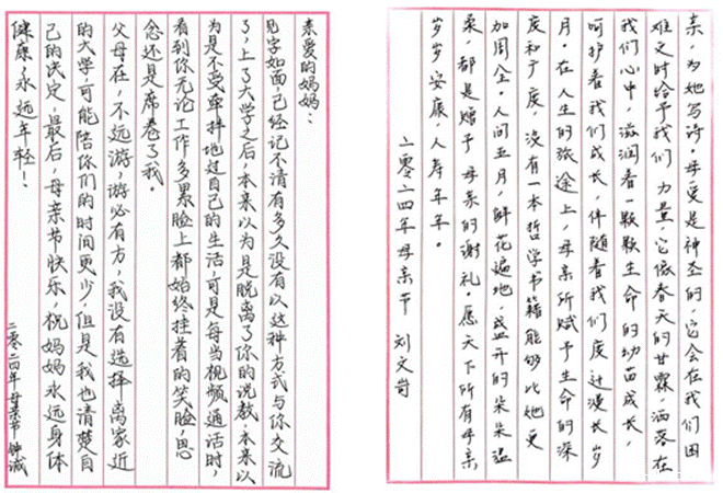 此次活动以“弘扬传统美德,温润青年心灵”为主题,强化党建统领,通过“心理+”模式开展心理育人实践,培育学生良好的心理品质和道德风尚,丰富实践育人载体,增强实践育人成效。活动通过传统书信形式,表达对家人的感恩之情,使同学们回归本真,用心感受爱的伟大与无私。同学们充分发挥特长爱好,踊跃提交散文、诗歌、随笔、书法等不同题材类型的作品,作品主题鲜明,排版美观,文字优美,表达流畅,展现了土木青年学子弘扬中华传统美德的良好精神风貌。
